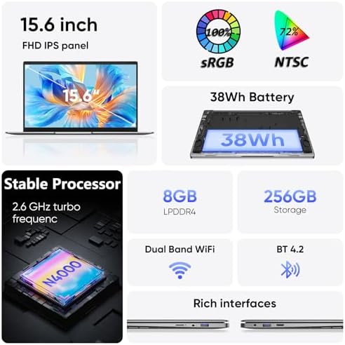 15.6" Laptop, 8GB RAM 256GB Storage, Celeron N4000 (up to 2.6GHz) 100% sRGB Screen, MS Office 2024, Win11 Pro Notebook Computer, Dual Band Wi-Fi, BT4.2, USB-A, Long Battery Life, Silver