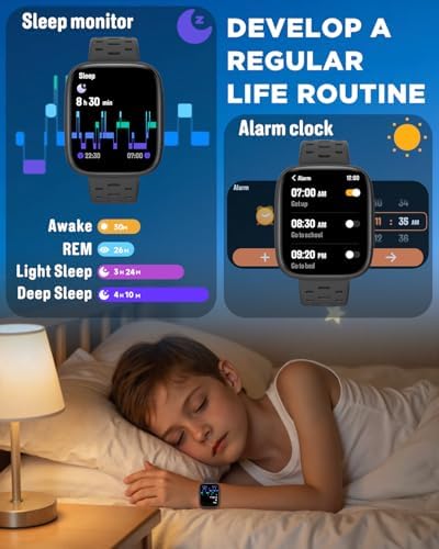 - Monitor Health and Develop Healthy Habits: Monitors real-time heart rate and tracks sleep patterns to promote your child's well-being. Up to 10 alarms can be set per day (supports vibrate mode) to remind your child what to do at each time point and help them develop regular living habits.