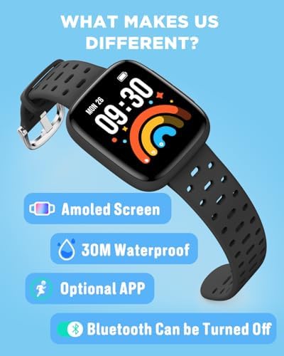 BIGGERFIVE Kids Watch No Phone Needed, 1.8" Amoled Smart Fitness Watch Pedometer, Heart Rate, Sleep Tracker, 30m Waterproof, Step Counter, Puzzle Games, 100+ Dials, Gifts for Boys Girls 5-16, Black