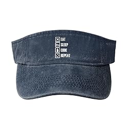 【Visor Hat Material】The Eat sleep code repeat, funny, programmer Womens Sun Visor Hats are made of premium Washed Denim Cotton, which is lightweight, soft and skin-friendly. Denim Empty Top Sun Cap can effectively absorb sweat and block UV rays,Visors Hat for Men preventing your skin from sunburned and keeping your head cool and breathable in hot summer. 【Sport Sun Visor Hat 】:Eat sleep code repeat, funny, programmer visor cap One size : 20.5-24.8 in, The sunscreen visor cap empty top design allows for better ventilation, keeping you cool and not messing with your hairstyle. The adjustable magic sticker at the back of the cap and an elastic band ensures a wide range of fit, offering a comfortable and secure wear. 【Women Sun Hat】The Eat sleep code repeat, funny, programmer Visor Hat for Women Men is designed with an empty top so that the head has a circular air space to expose to air with no pressure. The wide brim of the visor is sunproof, windproof and block out sunlight reaching the eyes, shading the face to protect the skin, so they're the perfect accessory for driving, jogging, sports, and other outdoor activities. 【Mens Visor Hat 】: Eat sleep code repeat, funny, programmer Hat suitable for running,Pickleball, running visor hat,Softball, Football,sports,baseball, gardening, walking, playing golf, biking, playing grass volleyball, tennis, mountaineering, walking, traveling,boating, travling,beach,picnic, vacation,travle and other outdoor occasions. This Beach Hats for Women is suitable for men and women regardless of gender.It is a must-have for anyone's all-season wardrobe. 【Funny Dad Hat Gift】: Eat sleep code repeat, funny, programmer sun visor hat are great gift for your family, friends and loved ones. Give your loved one a fashionable hat for birthdays, Christmas, New Years, Halloween and so on. Best choice for gift giving. Use fashionable sports cotton twill golf sun visor to enjoy and keep yourself on sunny days.