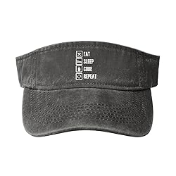 【Visor Hat Material】The Eat sleep code repeat, funny, programmer Womens Sun Visor Hats are made of premium Washed Denim Cotton, which is lightweight, soft and skin-friendly. Denim Empty Top Sun Cap can effectively absorb sweat and block UV rays,Visors Hat for Men preventing your skin from sunburned and keeping your head cool and breathable in hot summer. 【Sport Sun Visor Hat 】:Eat sleep code repeat, funny, programmer visor cap One size : 20.5-24.8 in, The sunscreen visor cap empty top design allows for better ventilation, keeping you cool and not messing with your hairstyle. The adjustable magic sticker at the back of the cap and an elastic band ensures a wide range of fit, offering a comfortable and secure wear. 【Women Sun Hat】The Eat sleep code repeat, funny, programmer Visor Hat for Women Men is designed with an empty top so that the head has a circular air space to expose to air with no pressure. The wide brim of the visor is sunproof, windproof and block out sunlight reaching the eyes, shading the face to protect the skin, so they're the perfect accessory for driving, jogging, sports, and other outdoor activities. 【Mens Visor Hat 】: Eat sleep code repeat, funny, programmer Hat suitable for running,Pickleball, running visor hat,Softball, Football,sports,baseball, gardening, walking, playing golf, biking, playing grass volleyball, tennis, mountaineering, walking, traveling,boating, travling,beach,picnic, vacation,travle and other outdoor occasions. This Beach Hats for Women is suitable for men and women regardless of gender.It is a must-have for anyone's all-season wardrobe. 【Funny Dad Hat Gift】: Eat sleep code repeat, funny, programmer sun visor hat are great gift for your family, friends and loved ones. Give your loved one a fashionable hat for birthdays, Christmas, New Years, Halloween and so on. Best choice for gift giving. Use fashionable sports cotton twill golf sun visor to enjoy and keep yourself on sunny days.