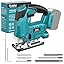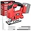 - 【Boost Productivity】The built-in dust-blowing function automatically clears debris during cutting, preventing obstructions and ensuring clear visibility. The external vacuum adapter allows you to connect a vacuum for a cleaner workspace. With an LED light and guide ruler, this cordless jig saw tool provides precise lighting and measurement in low-light environments, enhancing cutting accuracy and boosting efficiency
