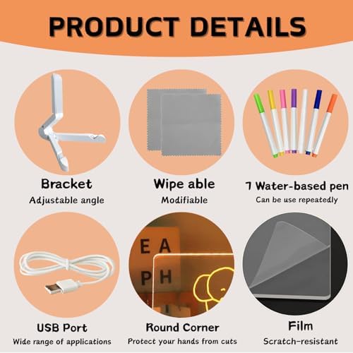 - Complete Drawing Kit Included: lumiboard led note board set includes an acrylic memo whiteboard, 7 markers, a sturdy triangular stand, a USB-powered LED light strip and microfibre cloth for easy erasing and reusing