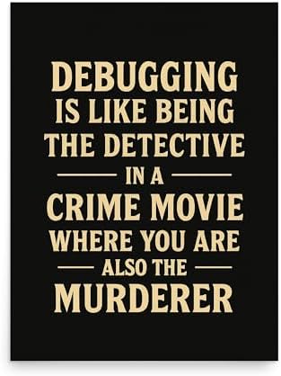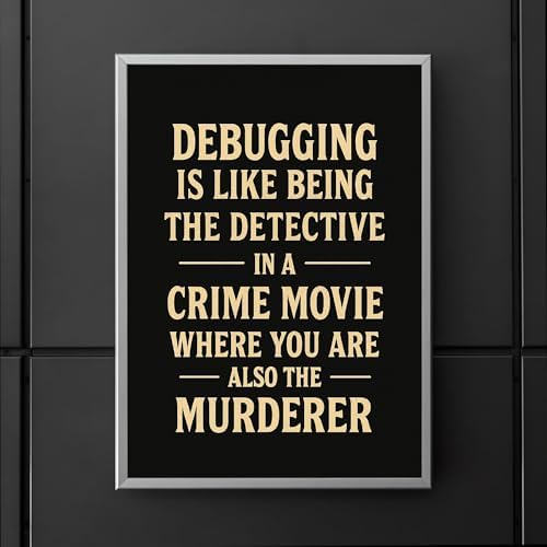 Searching for unique gifts for software developers? Your hunt ends here with this quirky and humorous debugging poster! Perfectly capturing the daily challenges faced by programmers, this poster features the hilarious quote: "Debugging is like being the detective in a crime movie where you are also the murderer." It's a delightful nod to the complex, often paradoxical world of coding, resonating with anyone in the tech industry. Ideal for sprucing up offices, home workspaces, or dorm rooms, this poster adds a light-hearted touch to environments where creative problem-solving takes place. Tech enthusiasts, budding programmers, or seasoned developers will all find joy in its witty wisdom. Beyond just decoration, this piece serves as a constant reminder of the persistence and creativity involved in programming. Whether for a special occasion or a surprise just because, this poster stands out as a thoughtful and amusing gift. Encourage smiles and spark conversations with a piece that reflects the true spirit of debugging brilliance. Designed with a blend of humor and insight, it's a fun and fitting tribute to the world of software development.