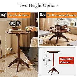 - Multi-Use Design: More than just a coffee table—this small round table seamlessly transforms into a side table, end table, or bedside table. Whether placed in the living room, bedroom, or hallway, it’s the kind of solid wood furniture that fits everywhere and does everything.Solid Wood Build: Crafted from strong rubber wood, this wood side table is built to last. Its warm finish and visible wood grain bring a natural charm that elevates modern and farmhouse décor alike, while the sturdy structure offers reliable support for daily use.Adjustable Height Options: Designed with a 24”) standard height that fits well with sofas, chairs, or as a living room side table. Remove the column to convert it into a 8.5” low table—great as a floor table, tatami table, or small coffee table for reading.