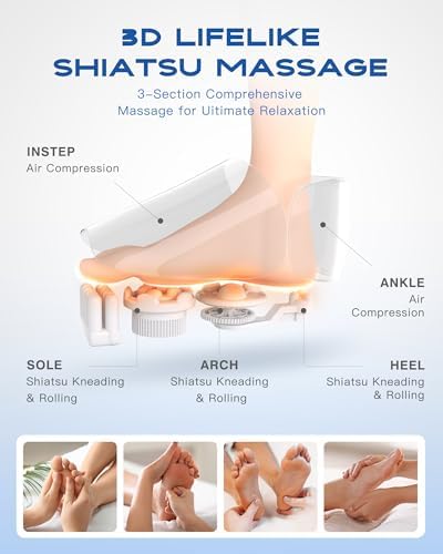 - 【FULL-COVERAGE FOOT PAIN RELIEF】 Experience professional-grade pain relief from heel to toe. This foot massager uses deep shiatsu kneading, rolling, and U-shaped air squeeze technique to work on tension muscles and ease foot pain. Ideal for office/sedentary workers or anyone seeking solutions for plantar fasciitis, neuropathy, or everyday foot discomfort.