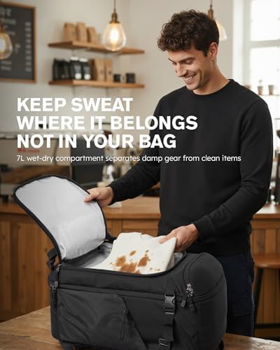 - 【7L Wet-Dry Compartment & Large Water Bottle Holder】Stay fresh and organized. A 7L front wet-dry compartment lined with eco-friendly aluminum film keeps sweaty or used clothes, towels, or swimwear separate. The large side pocket fits bottles up to 40oz (base under 4") and secures with an elastic cord. This travel laptop backpack keeps gym, hiking, or outdoor essentials organized and accessible
