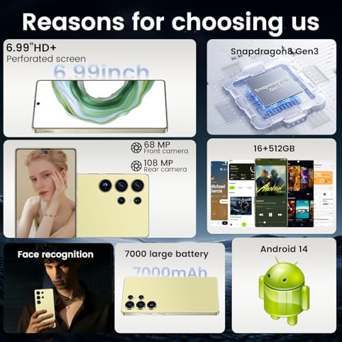 • 【16GB RAM + 512GB Storage – Future-Proof Power】 Unlock unmatched multitasking with 16GB RAM and store 150,000+ photos/videos on 512GB storage—double the capacity of most phones.Unlike competitors with slower RAM and limited storage, the I25 Ultra runs 20+ apps seamlessly and supports 4K video editing without lag.Pre-installed Android 14 ensures 3 years of updates, while others lag on older OS versions.