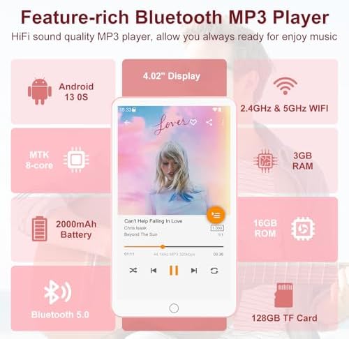 144GB MP3 Player with Bluetooth WiFi, Android 13 OS MP3 MP4 Players with 4" Touchscreen and Speaker, Spotify Music Players with Audible, FM Radio, Amazon Music, Play Store (Pink)