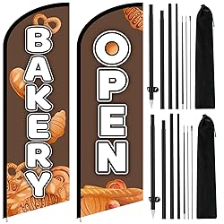Package Includes: this comprehensive bakery feather flag kit includes one bakery feather flag, one open shop feather flag, and two steady flag poles; Designed to meet your needs, it's ideal for attracting attention and showcasing your products Reliable Construction: made of tricot fabric, these bakery and open shop signs are reliable and sturdy, machine or hand washable, and resist fading; They can be fixed to your store entrance, ensuring long-lasting visibility Suitable Size: these bakery open shop flags measure approximately 6.1 x 1.8 feet / 186 x 55 cm, and approximately 8.2 feet / 2.5 meters when assembled; They're ideal for displaying in your yard or at your bakery entrance, drawing attention from all directions and enhancing visibility Eye-catching Design: these bakery open shop flags feature a dark background and a variety of enticing bread designs; The large "BAKERY" and "OPEN" text creates a striking contrast against the background; This design sparks interest and attracts customers, making these feather flags a choice for your business, warm reminder: this product is single-sided printing Easy Assembly: this bakery open flag kit is easy to install, no complicated steps required; The lightweight and compact kit ensures smooth transportation and installation in minutes, allowing you to focus on attracting customers and promoting business growth