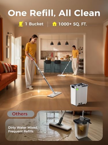 - 🔄️One Fill, All Clean — Large Capacity Covers Up to 1000+ Sq. Ft. Two separate 6L tanks for clean and used water help you avoid repeatedly changing water caused by dirty-water reuse. With this design, one fill is enough to clean your entire home—saving time, effort, and supporting more efficient use of water. And when you’re done, the bottom drain plug lets you empty the bucket smoothly and without hassle.