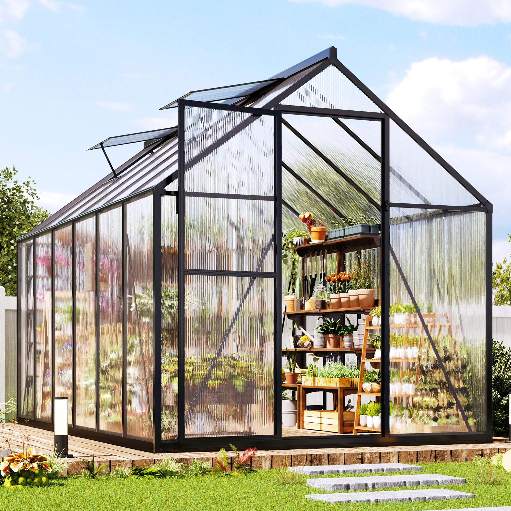 Our greenhouses are made of high quality pure fir wood and high quality hardware to withstand harsh weather conditions. This rugged structure ensures stability and durability even during strong winds and heavy rains. Protect your plants and make them thrive in a reliable outdoor greenhouse that will stand the test of time. Our greenhouses provide fresh space for your plants and promote optimal plant growth through Windows with adjustable opening angles. Vents located at the top allow you to regulate airflow and maintain the ideal interior environment of the greenhouse, providing a healthy ventilation system and balanced temperature for your plants in different seasons. Composed of clear and translucent polycarbonate panels, provide 99.99% UV protection. Polycarbonate panels offer enough sunlight for your plants and block damaged UV. This greenhouse has a front door for entry and exit, which can be locked to prevent items from being lost. Add a tea table and other furniture to the greenhouse, and decorate the greenhouse into a warm space. With our greenhouses, you can set up your own garden paradise in a short time. The kit includes detailed instructions and the necessary tools to make the installation process easy. Save time and effort while ensuring a sturdy and safe outdoor greenhouse.