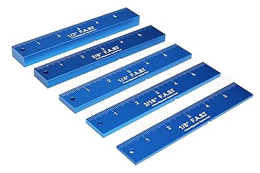 PRECISION FENCE ALIGNMENT TOOL: Place a magnetic bar on the blade, seat the tooth notch flat to the blade body, then set the fence for dead-straight, square cuts in seconds. MAGNETIC & STACKABLE DESIGN: Bars snap together to create any required spacing—build the exact blade-to-fence distance you need without math or shims; magnets hold firmly to metal surfaces. FIVE EXACT THICKNESSES INCLUDED: 1/8", 3/16", 1/4", 3/8", 1/2" (≈3.18, 4.76, 6.35, 9.53, 12.70 mm) cover common setups; mix and match for countless combinations. FENCE ALIGNMENT + ROUTER SETUPS: Use as a Fence Alignment Tool for table saws and to set router bit height/depth; the ruled scale helps you dial in precise fence distance fast. REPEATABLE RESULTS, LESS FIDDLING: Speed up changeovers, reduce test cuts, and store bars together magnetically—an essential woodworking tool for accurate, consistent cuts.