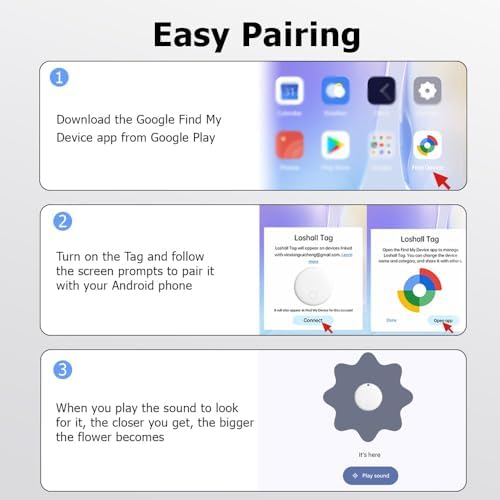 - 【Easy Pairing & Data Security】 Android tracker tags has simple settings. Switch on Bluetooth and Press the power button once, then pairing with your device when you see the popup. The Google Find My network is encrypted and anonymous. The location data and historical records of your items will not be stored, and the Google system cannot know, safe for our daily using . Only you can access the location of the items to ensure maximum privacy protection