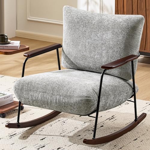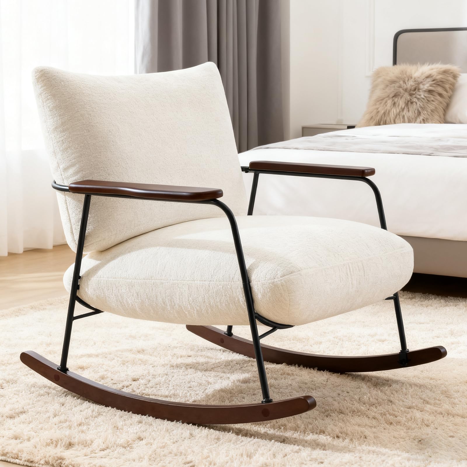- 🛋️[Soft Upholstered Comfort] Filled with high-density sponge and covered in breathable fabric, this rocking chair delivers a soft yet supportive seating experience. The thick padded cushion and wide seat allow you to relax for hours in total comfort.