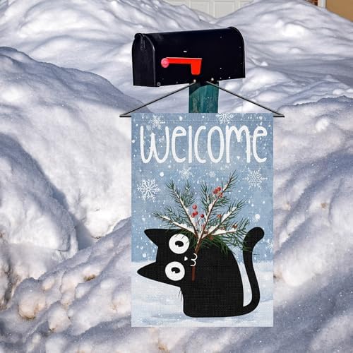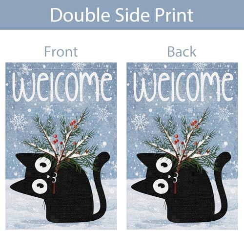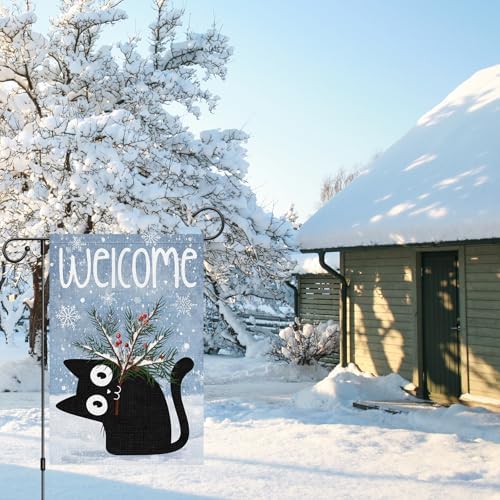- Festive Winter Welcome Flag:Celebrate the season with our charming winter garden flag. Features a friendly black cat carrying a pine branch amidst falling snowflakes. Suited for decorating your garden, yard, or porch to spread holiday cheer