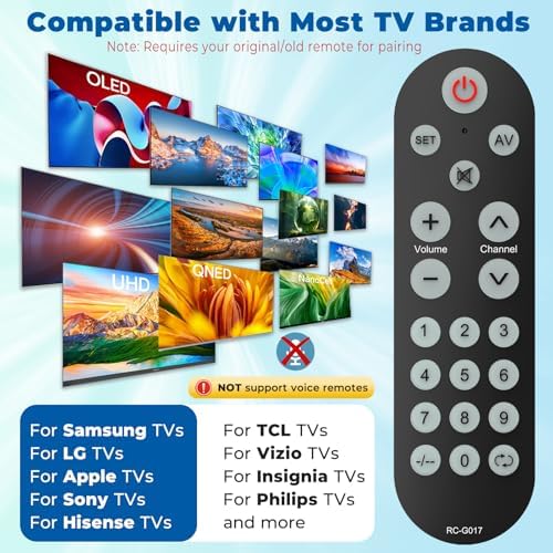 - Compatible with All IR Remotes: This upgraded universal TV remote works with TVs (Samsung, LG, Toshiba, Sony, Panasonic, Sharp, Philips, and more), DVD players, set-top boxes, and other devices controlled by IR remotes. (Note: Requires your original/old remote to pair. NOT compatible with voice remotes.)