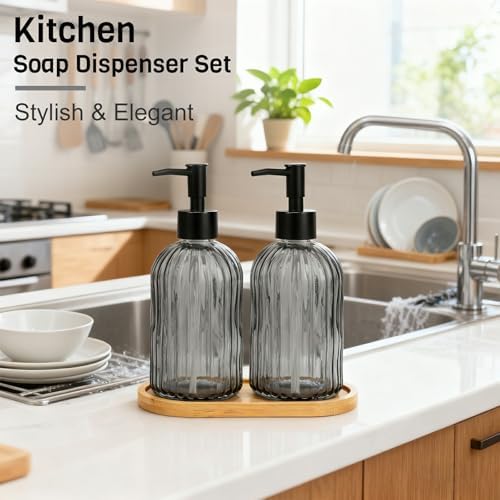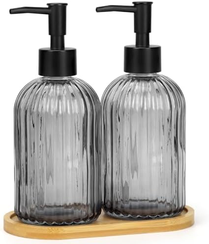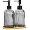 2 Pack Stripe Glass Soap Dispenser with Black Plastic Pump & Bamboo Tray, 400ml Liquid Hand Soap Dispenser for Kitchen & Bathroom, Great for Lotions, Essential Oil, Liquid Soaps-Gray