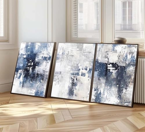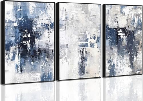 3 Pcs Black Frame Navy Blue Abstract Canvas Wall Art Modern Minimalist Neutral White Blue and Grey Paintings Pictures Wall Decor Poster Print Artwork for Living Room Bedroom Office Home Decora