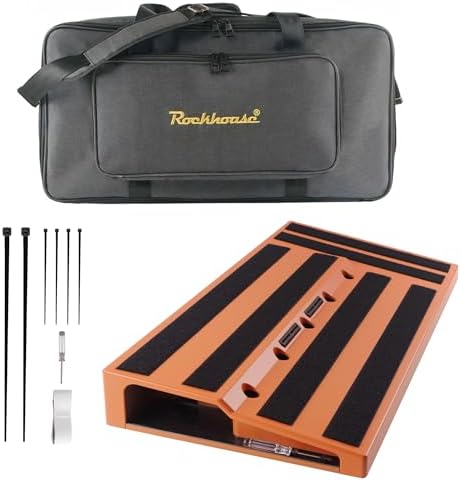 Transform your guitar effects setup with this professional-grade Rockhouse pedalboard and carrying case combo. The sturdy 22 x 11-inch orange pedalboard features a clever built-in compartment designed specifically for housing your power supply, helping to maintain a clean, organized layout. The non-slip pedal surface keeps your effects securely in place while the included mounting accessories make setup a breeze. The matching premium carry bag, adorned with the Rockhouse logo, provides ample protection and easy transport for your gear. With dimensions of 22.05 x 11.02 x 2.76 inches, this pedalboard offers generous space for multiple effects pedals while remaining compact enough for convenient storage and transport. Perfect for both gigging musicians and home studio setups, this complete solution includes all necessary mounting materials to get your pedal configuration up and running.