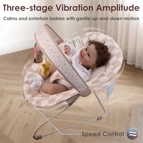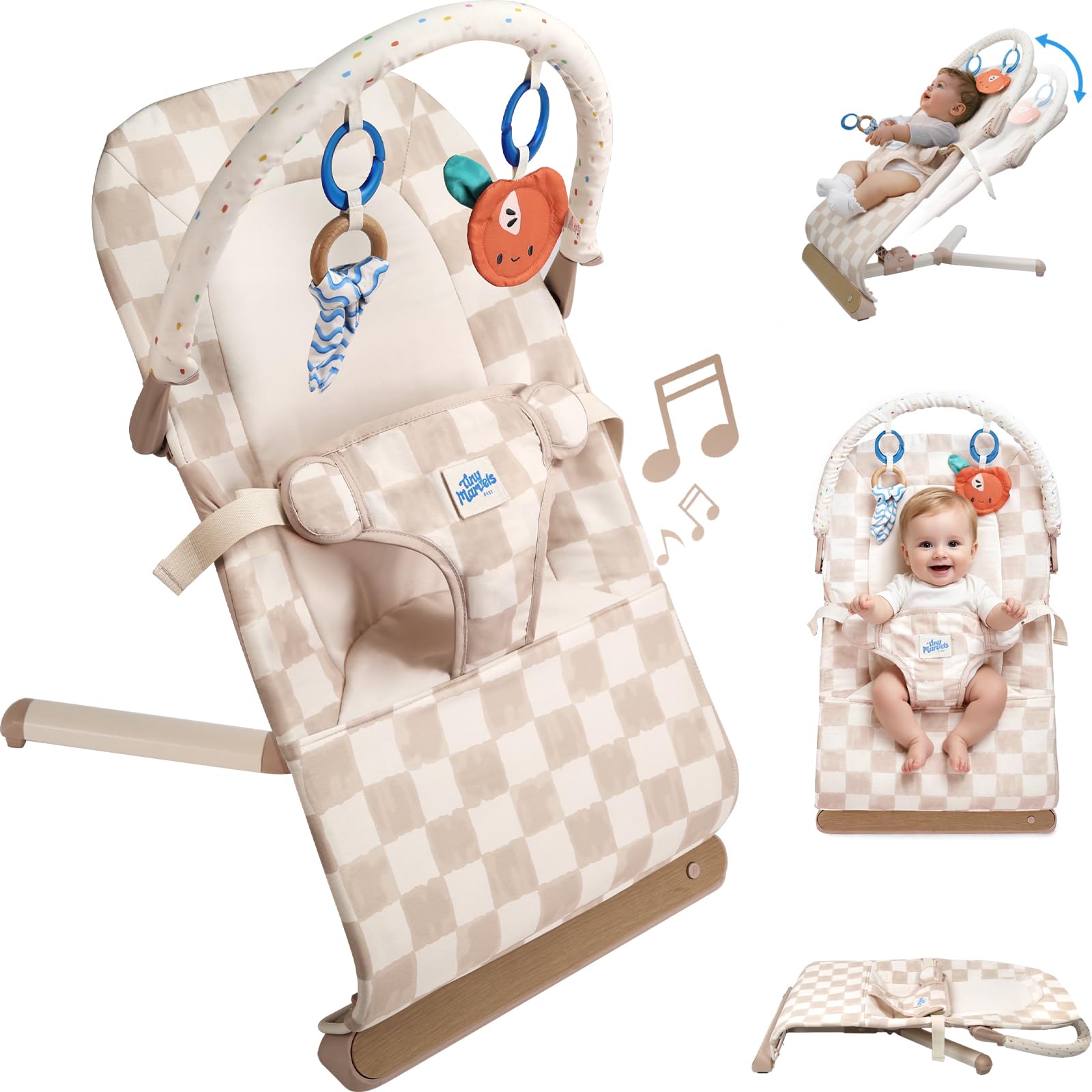 Baby Bouncer – Baby Bouncer seat, Infants Bouncy Seat with Music & Sensory Toys, Compact & Machine Washable Seat Pad Indoor Infant Seat, Ideal for Newborns 0-6 Months, Max Weight 20lbs (Sand Checker)