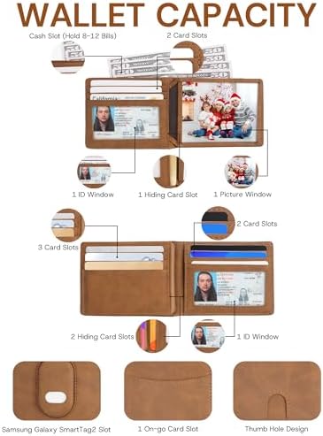 - 【Great Capacity】The card wallet have 8 card slots, 2 hidden slots, 2 ID windows, 1 Picture Window, 1 cash pocket. It can hold a total of 10 cards. Classify money and cards, easy to put in and take out, you'll have plenty of space to store all your cards and cash. Say goodbye to cluttered and bulky wallet.
