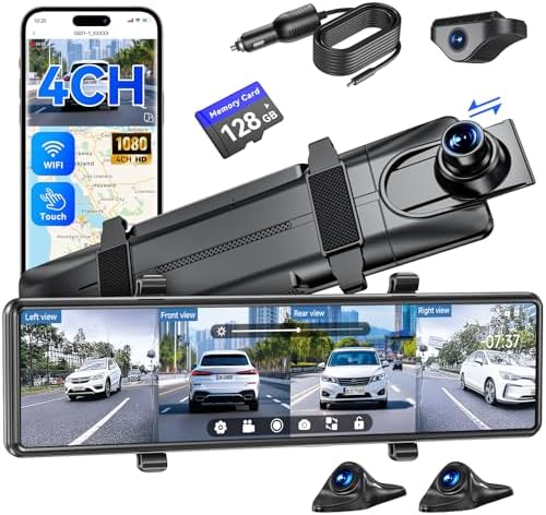 4 Channel Mirror Dash Cam,12" Rear View Mirror Camera,Dash Cam Front and Rear Side(Left,Right),Touch Screen DashCam,Automatic Reverse Camera, Parking Monitor,Free 128GB Card
