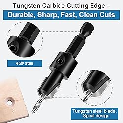 - This adjustable countersink drill bit set is designed for clean, consistent screw seats in woodworking projects. With five sizes from 2.5mm to 3.5mm and precision depth-stop collars, you can drill repeatable, professional-quality holes for cabinetry, furniture building, and DIY work. The tungsten carbide cutting edge provides fast chip removal and burr-free results, while the fully ground, polished 45# steel body ensures long-lasting durability. The complete kit includes spare pilot drills, PH1/PH2 bits, a 1/4" extension rod, and two depth collars, all stored in a compact case for easy organization. The universal 1/4" hex shank fits cordless drills, electric drills, and drill presses, making bit changes quick and efficient. Suitable for softwood, hardwood, plywood, MDF, particle board, and plastics, this set delivers reliable performance across a wide range of woodworking tasks. Not for use on metal, concrete, glass, or drywall.