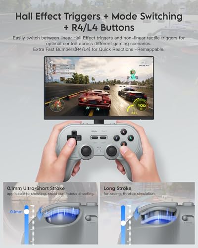 - 【𝐀dvanced 𝐓𝐌𝐑 𝐉oysticks & 𝐀daptive 𝐓rigger 𝐒ystem】: High-precision TMR joysticks with 12-bit ADC sampling chip deliver exceptional accuracy and responsiveness. Dual-mode trigger system easily switches between linear Hall Effect triggers for racing games and non-linear tactile triggers for shooters, providing optimal control across diverse gaming scenarios.