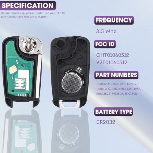 - Replacement Parts Number: Compatible for FCC ID: OHT01060512 / V2T01060512. Fits for Part Numbers: 13500222 13500227, 13501913 13504200, 13504203 13504258, 20873623 5913596, 5913598. Frequency: 315MHz. Battery Type: CR2032/Coin. 4 Buttons Function: Lock, Unlock, Trunk, Horn. (Before purchasing, please verify that your FCC ID, part number, and frequency match.)