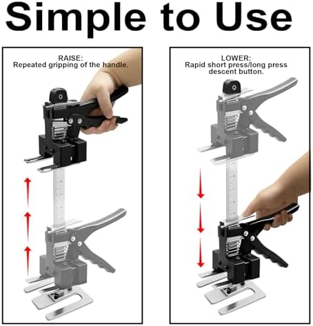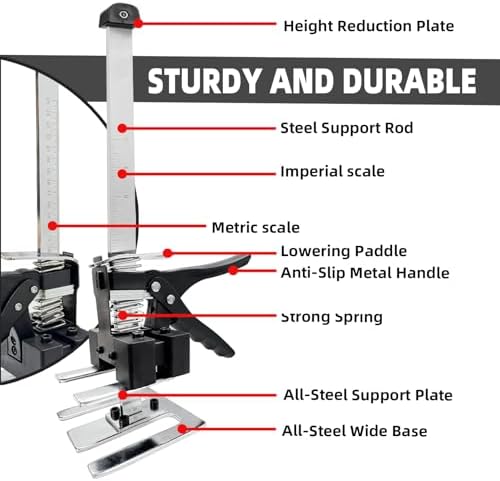 - UPGRADED MULTIFUNCTIONAL JACK ARM:All-steel construction ensures maximum durability for lifting, pressing, and precise fastening.Easily adjust height by pressing the handle—ideal for tile leveling, cabinet installation, and door positioning