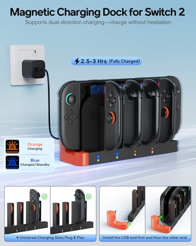 - 【Charge 4 Controllers Simultaneously】Designed for Joycon 2 controller, the fast charger dock powers up to 4 controllers at once. Its smart bidirectional charging ports eliminate worries about orientation. The dock-integrated design plugs directly into your original dock, reducing cable mess for a clean, organized setup