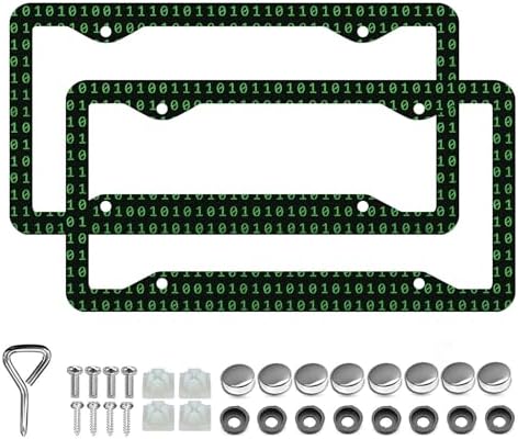 Green Binary Code License Plate Frames - 2 Pack Aluminum Front & Rear Auto Car Tag Holder, 4 Holes Heavy Duty Bracket with Mount Hardware, Rattle Proof Screws Fasteners Caps