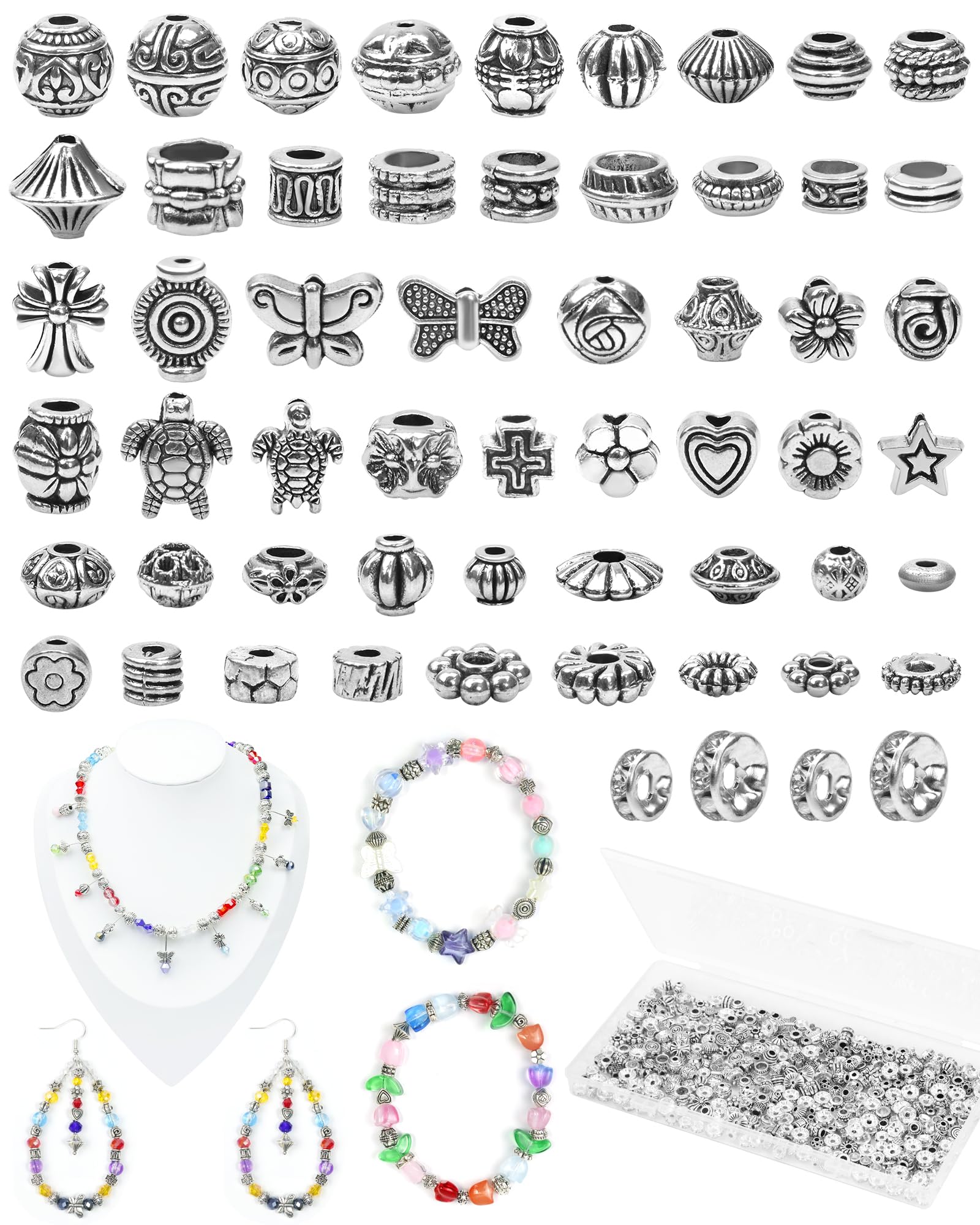 - Fun Shapes:The antique silver spacer beads are very cute, with more than 50 charming designs available: flowers, hairpin-style, tires, lanterns, stars, and more! Pair them with the sparkly rondelle spacer beads, and you’ll get endless combinations. It can also be paired with natural stones, bubble beads, silicone beads, and other accessories.—no more boring designs. These silver beads for jewelry making let your creativity run wild