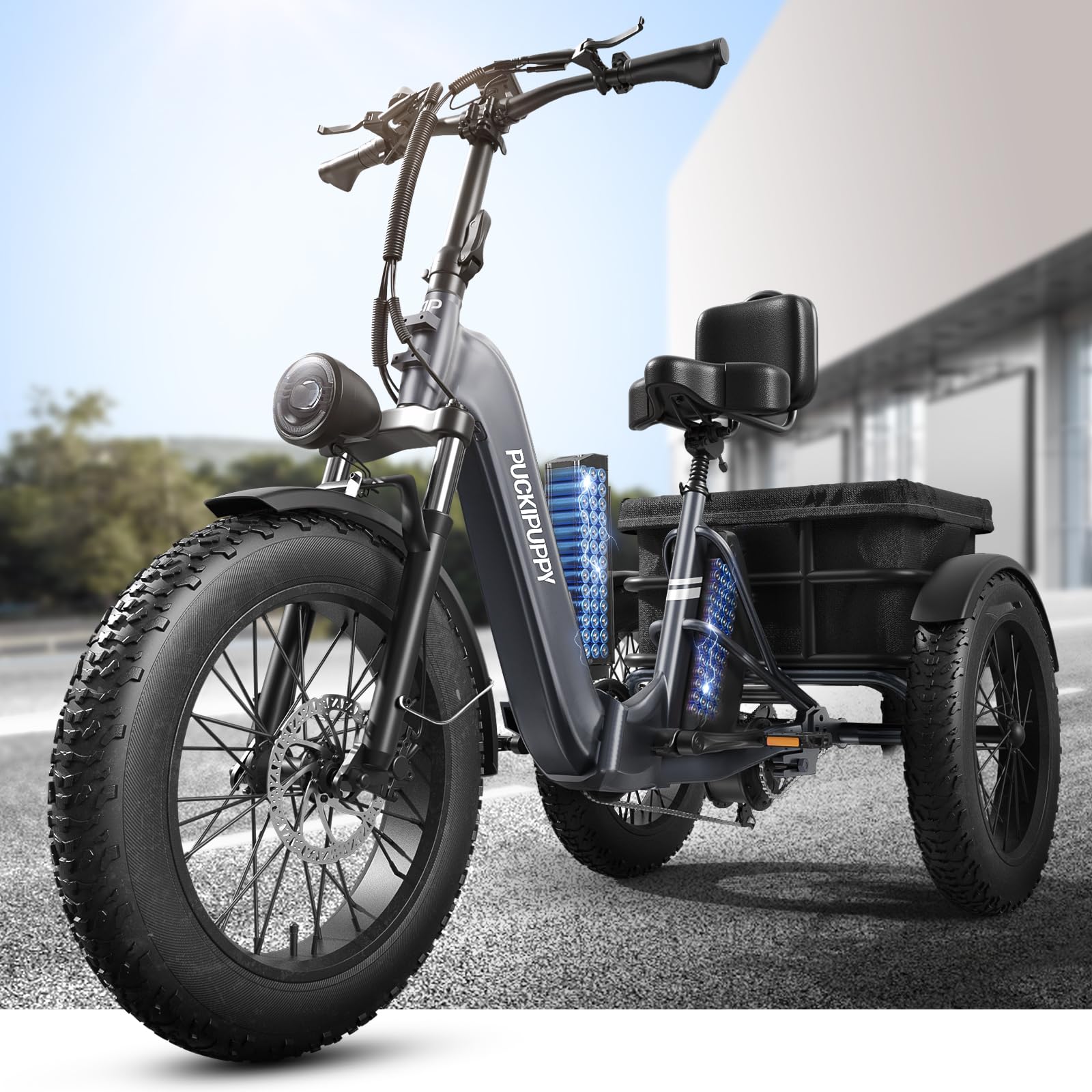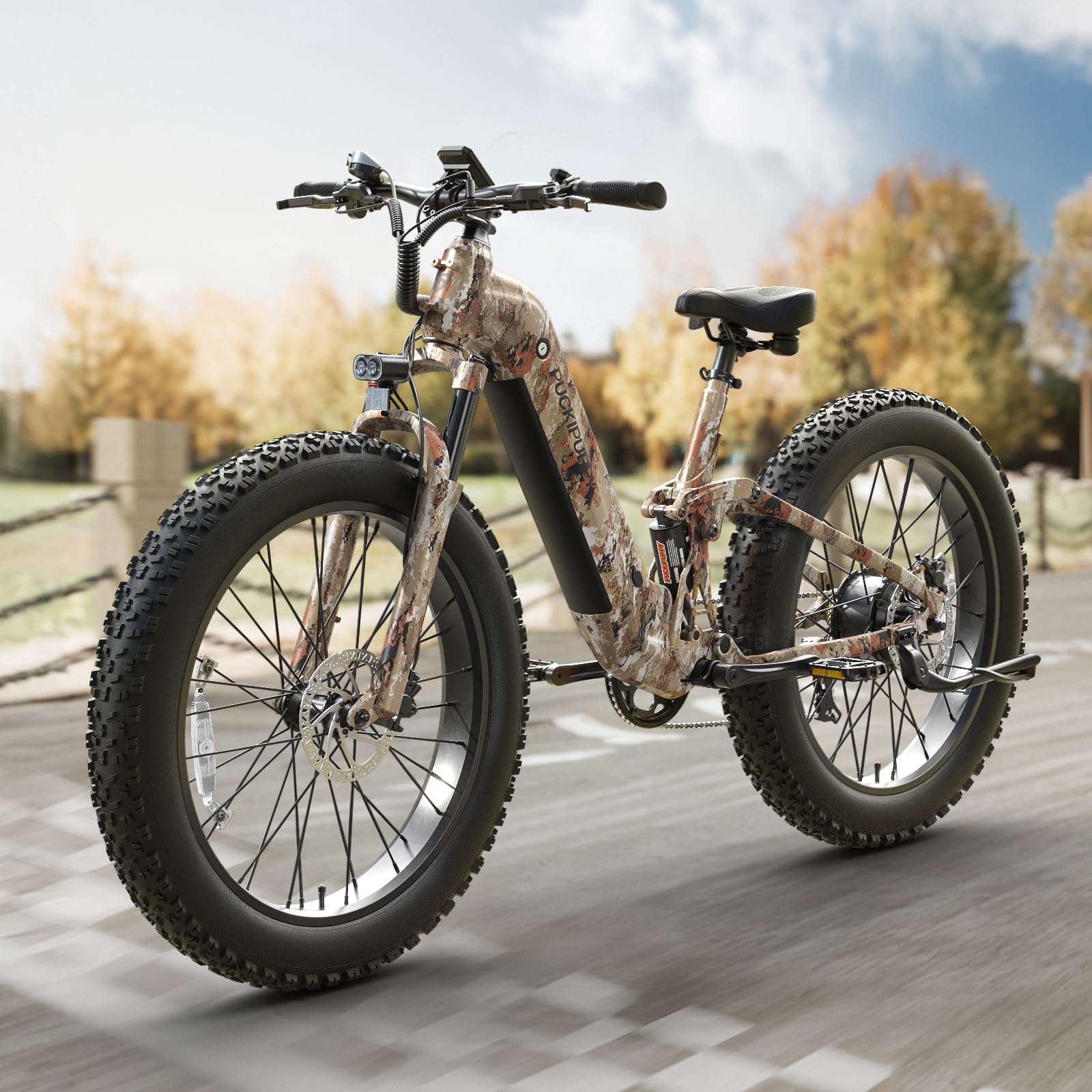 - Full Suspension System & Hydraulic Disc Brakes: PUCKIPUPPY's full suspension system features a new longitudinal rear suspension and lockable and adjustable hydraulic suspension fork that allows you to explore the cityscape while minimizing bumps in the ride, reducing vibration, and improving ride safety. Whether it's an uneven surface or a gravelly trail, dual 180mm hydraulic disc brakes are able to handle it with ease and enjoy a silky smooth ride.