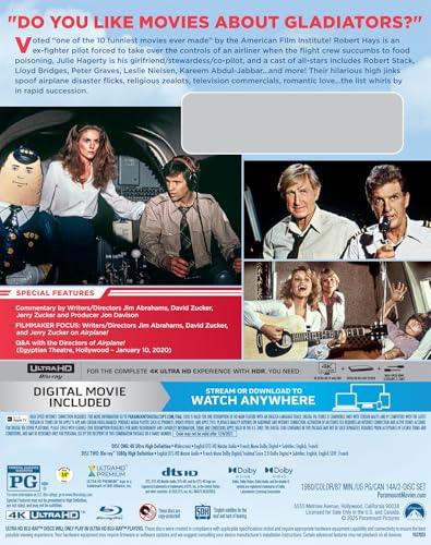 One of the craziest, most outrageous comedies ever, the Zucker-Abrahams-Zucker team's spoof of "Airport"-style disaster films took the plot of a jeopardized transcontinental flight from the 1957 thriller "Zero Hour" and crammed it with more rapid-fire jokes, more silly sight gags, more deadpan deliveries, and more corny puns than any movie has the right to. Robert Hays, Julie Hagerty, Leslie Nielsen, Robert Stack, Lloyd Bridges, Peter Graves, Lorna Patterson, Kareem Abdul-Jabbar, and Stephen Stucker as Johnny star. 87 min. Widescreen; Soundtracks: English DTS HD 5.1 Master Audio, French Dolby Digital Mono; Subtitles: English (SDH), French; audio commentary; featurettes. Two-disc set.