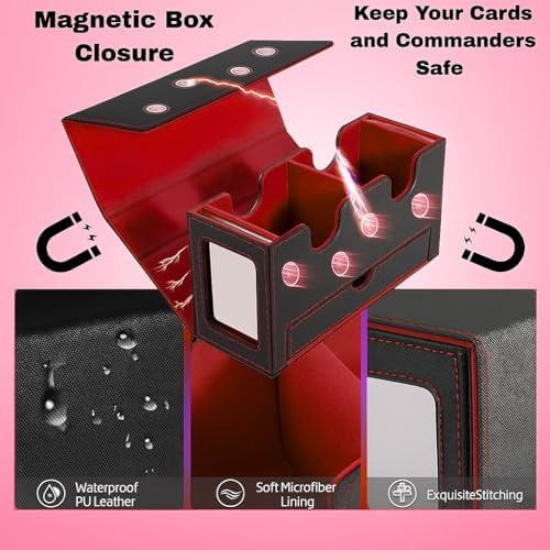 Card Deck Box, MTG Commander Card Deck Box, 2 Commander Display, Fits 200 Double Sleeved Cards, Storage Box with Dice Tray for CCG TCG Sports Cards (Black Red)