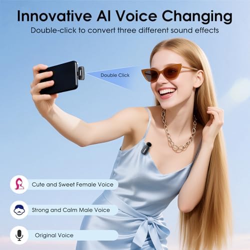 - Innovative AI Voice Changing: The mini vlogging microphone supports 3 types of AI voice changing. Double-click on the receiver's function key to convert, one blue flash is ‘male voice’, two flashesis ‘female voice’, three flashes is the ‘original voice’. You can enjoy a variety of tones, making recording more fun.