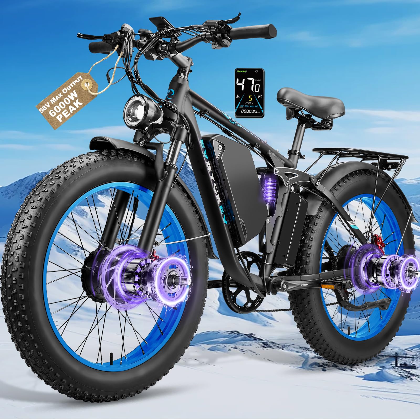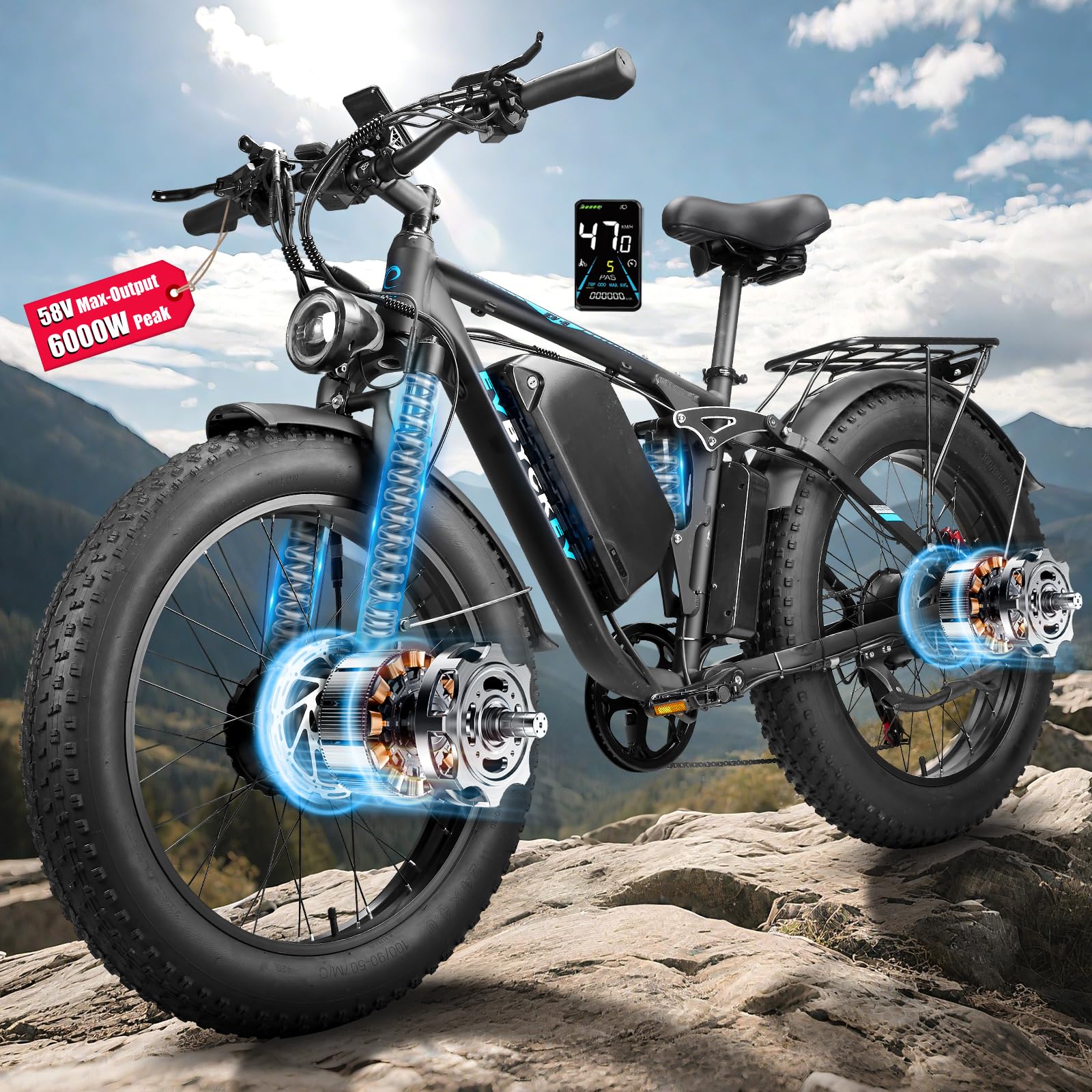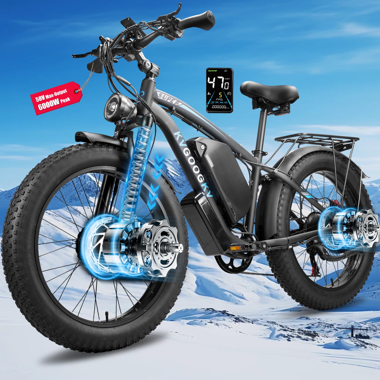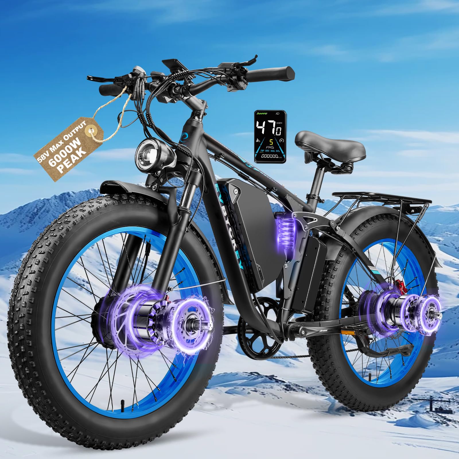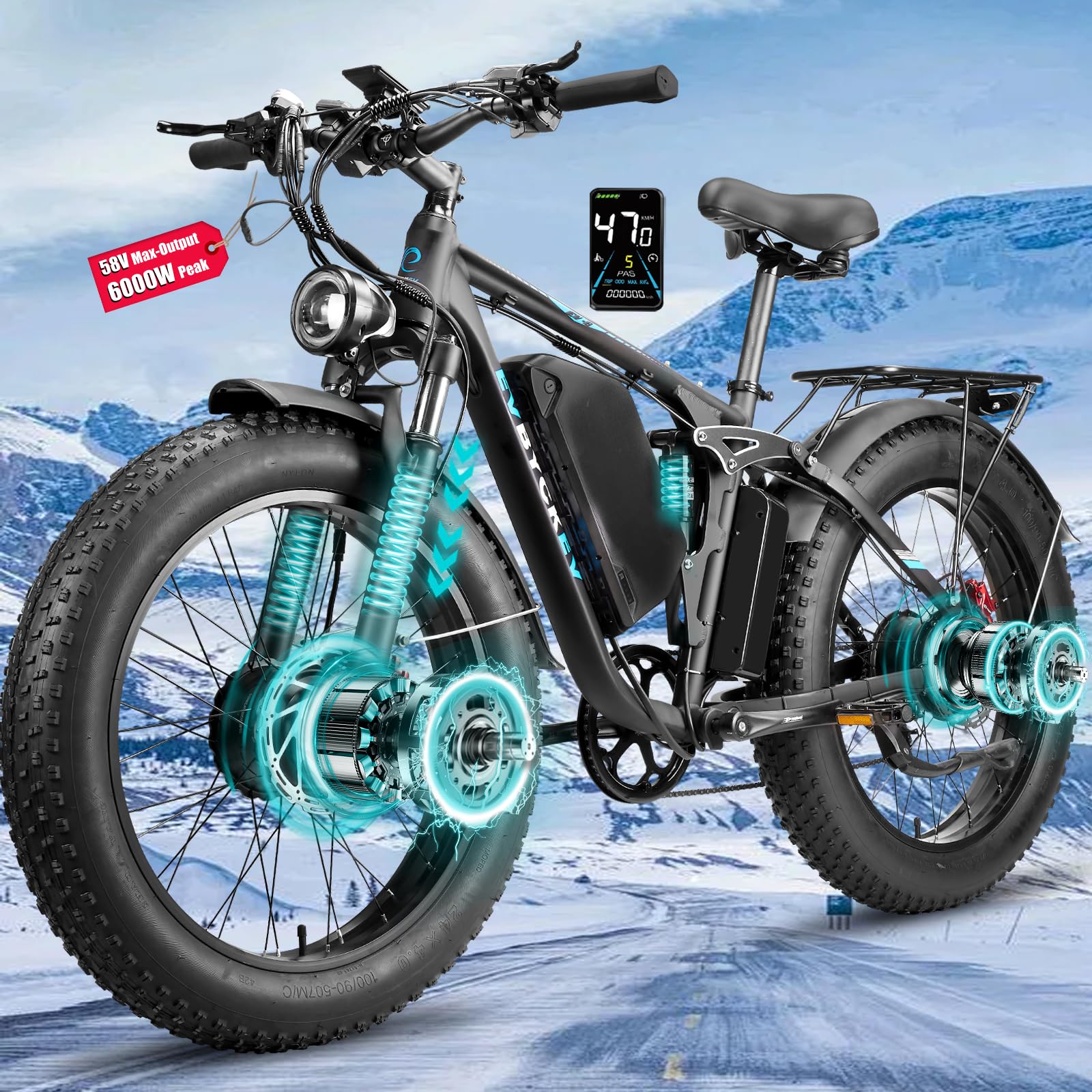 6000W Peak Electric Bike for Adults,58V Max-Output 1856Wh Dual Motor Ebike,34Ah Battery 47MPH Up to 105Miles Fast 24" x4.0 Fat Tire Ebike,Full-Suspension Mountain E-Bike for Beach Snow Sand Mountain