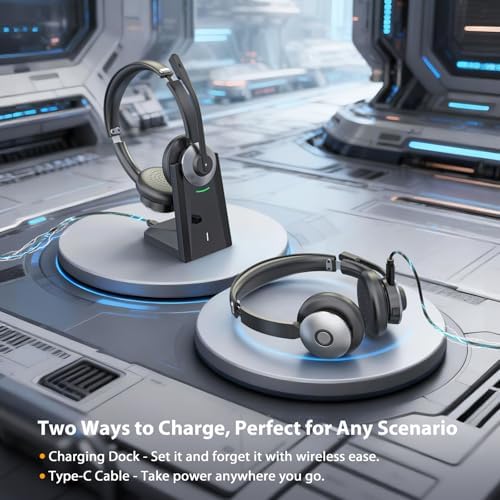 - 【Long Battery Life & Charging Dock】This wireless headset with mic for work is built for endurance, powering through up to 26 hours of talk time or 200+ hours on standby. For effortless power management, the laptop wireless headset includes a plug-and-play charging dock supporting both dock placement and a TYPE-C cable. It's the perfect companion for full office shifts and long road trips.