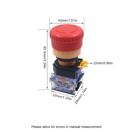 Feature:【Reliable and Strong】Constructed with high quality materials, this 22mm latching push button switch ensures durability. The metal and plastic combination can withstand frequent use and harsh environmental conditions, providing you with a reliable long term solution. 【Latching Function】The latching feature of this push button switch is designed for convenience. With a simple press, it latches into the on or off position. This self-locking mechanism is perfect for applications where continuous operation or prevention of accidental switch-off is required, such as in control panels of machinery or in power-on/off circuits of certain devices.【Enhanced Protection】Equipped with dustproof and waterproof, this emergency stop button is suitable for use in dusty workshops or humid conditions without compromising its functionality or safety. With strong bounce it can be easily open and close, it brings you smooth switching experience.【Easy to Install】Designed for hassle free installation, the switch has a mounting hole size of 22mm/0.86in, which is a standard size in many panels. The snap fit contacts allow for quick and secure attachment. 【Wide Application】 Ideal for a wide range of applications, this switch is perfect for automotive, marine, industrial, and household equipment. It ensures safety and reliability whether used in vehicles, boats, or on coffee machines and medical equipment.Specification:Name: Emergency Stop ButtonMaterial: Metal, PlasticModel: BSize: As ShownRated Current:10AOpening Diameter:22mm/0.86inPackage Included:2 * Emergency Stop Button