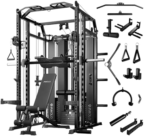 - 【All-in-One Home Gym Station】 The Mikolo Ultimate All-in-One Smith Machine Home Gym consolidates a complete commercial-grade training system into a single power rack footprint, integrating 10 professional stations: power rack, functional trainer, lat pulldown/low row, Smith machine, vertical leg press, chin-up bar, dip station, core trainer, and suspension trainer. The package includes 10+ premium attachments, 6 weight storage pins, and 4 dedicated attachment hooks