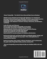 - Master PostgreSQL – The World’s Most Advanced Open-Source Database Whether you’re a beginner just starting with databases or an experienced developer looking to sharpen your SQL skills, this book is your complete guide to PostgreSQL. Known for its reliability, flexibility, and powerful features, PostgreSQL is the database of choice for startups, enterprises, and developers worldwide.Inside this book, you’ll discover: ✅ How to install and configure PostgreSQL on any system ✅ Essential SQL commands and database design principles ✅ Advanced queries, functions, and indexing for maximum efficiency ✅ Performance tuning tips to handle large datasets ✅ Step-by-step guides for real-world applications ✅ Best practices for security, backups, and database administrationBy the end of this book, you’ll have the skills to confidently design, manage, and scale PostgreSQL databases for any project—from small applications to enterprise-level systems.Perfect for students, data analysts, software developers, and IT professionals, this guide makes PostgreSQL simple, practical, and powerful.📘 Start your PostgreSQL journey today and take your database skills to the next level!