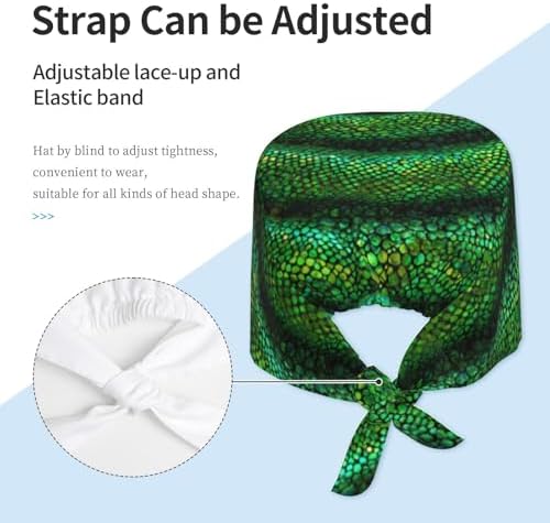 The WHJSHOP Emerald python pattern Prints Cleaning Working Cap is crafted from premium peach skin velvet (100% polyester), ensuring exceptional softness and comfort for all-day wear. Its innovative design features a sweat-absorbing forehead fabric that enhances breathability and moisture control, making it ideal for demanding environments. With an adjustable strap, this one-size-fits-most cap accommodates various head sizes, including those with long or thick hair, without feeling tight. Waterproof and versatile, it doubles as a shower cap to keep hair dry during bathing. Perfect for chef hats for women, cute scrub caps, surgical women nursing caps, women surgery cap, men's cap scrub, men nursing, women nurse scrubs, women scrub, men nurses, women's chef hat, hygiene, beauty spa, facial care, and fitness hat applications, it meets diverse needs in work, chemotherapy, rehabilitation, and daily routines.