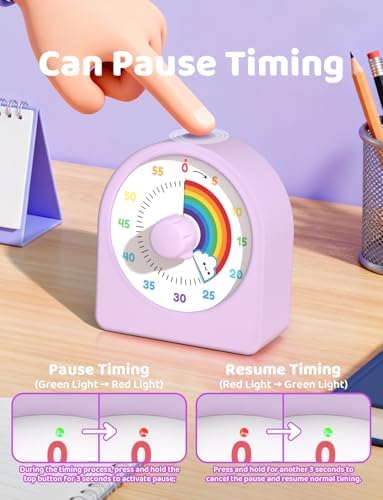 - [Countdown Pause Function] This visual timer for kids has a pause function. During the countdown, press and hold the round button for 3 seconds to pause, the indicator light will change from green to red. Press and hold the round button again for 3 seconds to cancel the pause and resume normal timing, the indicator light will change from red to green.