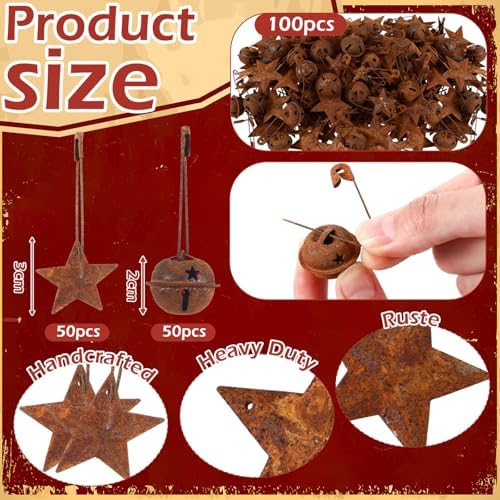 Features: This Christmas pin decoration is suitable for rustic-style decorations on Christmas trees, wreaths, branches, garden fences, porches, gardens, or cafe walls. This vintage bell and star ornament is made of durable, rust-resistant iron, and its naturally rusted surface further ensures long-lasting use. Please keep it away from clothing to avoid accidental rust stains. Specifications: Material: iron Color: rust Color Size: Bells: about 0.8 inches Stars: about 1.2 inches Pins: about 1.8 inches Package includes: 50 x Bells 50 x Stars 100 x Pins Notes: Manual measurement, please allow slight errors on size. The color may exist a slight difference due to different screen displays