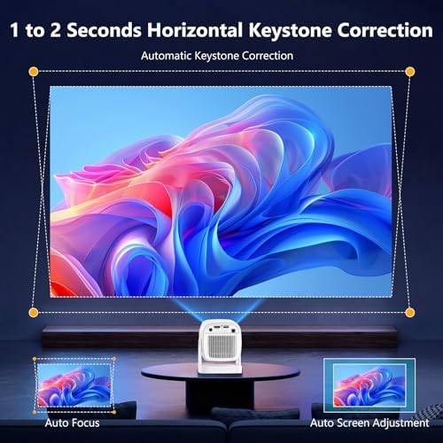 - 【Short Throw & Auto Keystone Correction】Projector 4K 1080P combines auto-focus and auto-keystone correction, featuring a 0.8:1 short throw ratio. It projects a crisp 40-130 inch (16:9) image from just 1.97 to 8.2 feet away, delivering a large screen experience even in limited spaces. This makes it far more convenient and user-friendly than traditional manual focusing. Auto keystone correction automatically adapts to any wall surface, optimizing screen alignment in 1-2 seconds and eliminating placement constraints. No extra screen is needed—any flat white wall becomes your home theater, effortlessly bringing movies, photos, or games to life.