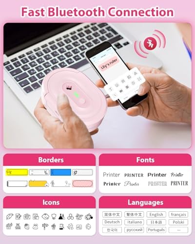 Label Maker Machine with Tape, N12 Portable Bluetooth Label Printer, Wireless Mini Label Makers Thermal Sticker with Multiple Templates for Home, Kitchen, School, Office Organization, Pink