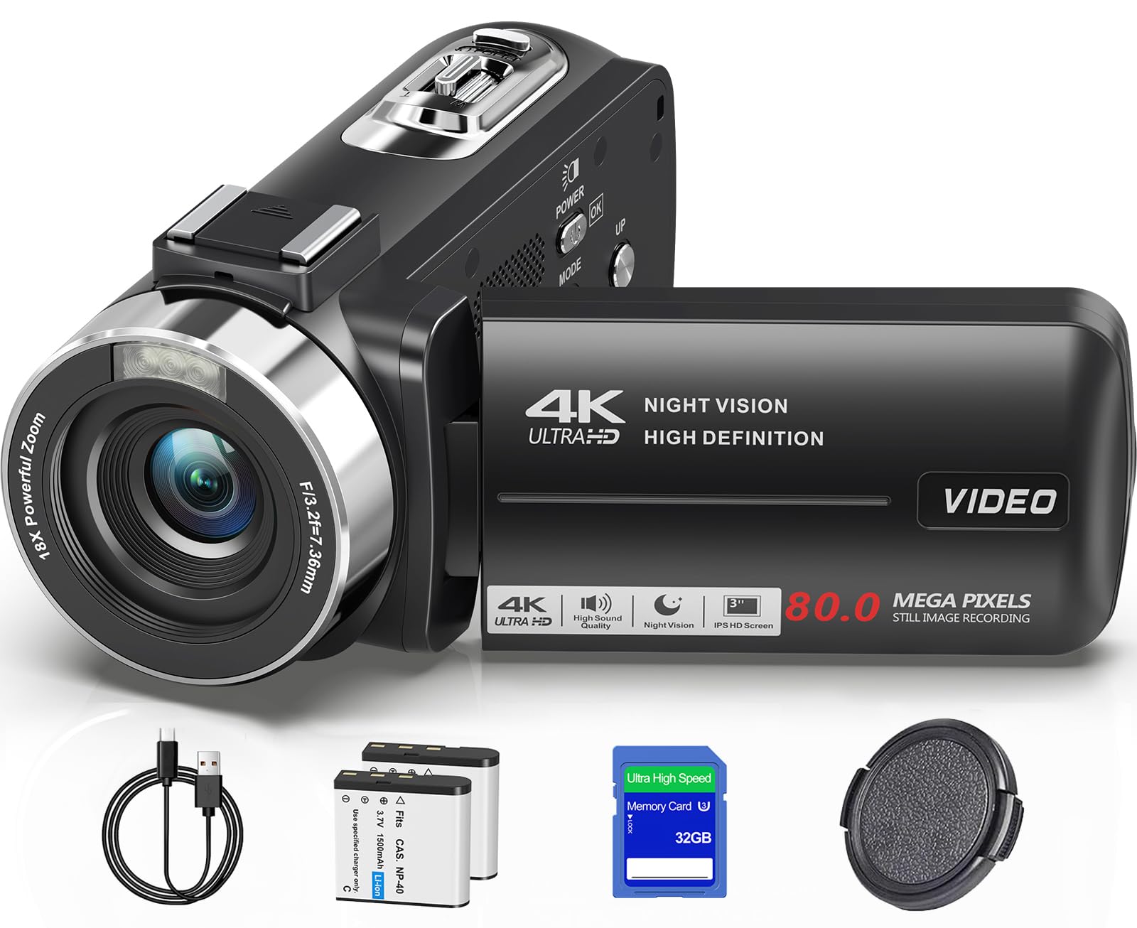 - 【Ultra HD 4K 80MP video camera】This 4K video camera offers an HD resolution of 4K (30 FPS) and an 80MP high pixel lens.Whether you're filming a happy family reunion or your children's childhood moments with this HD camcorder, you can capture everything precisely.Thanks to the 18X digital zoom, you can zoom in on distant subjects effortlessly. This video camera is ideal for videography beginners. Its compact design and weight of less than 500g make it easy to handle.