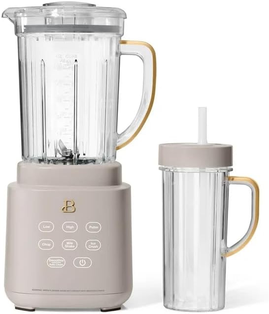 Beautiful PowerExact Blender System, Taupe by Drew Barrymore – 700 W Motor, PrecisionSense, Touch Display, 50 oz Tritan Pitcher + 20 oz Cup with No-Drippy Sippy Lid (White)